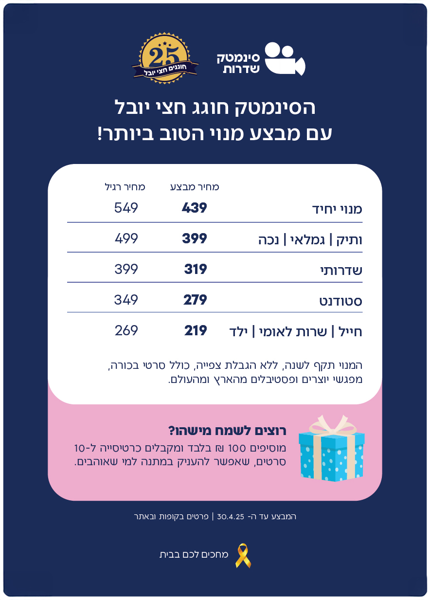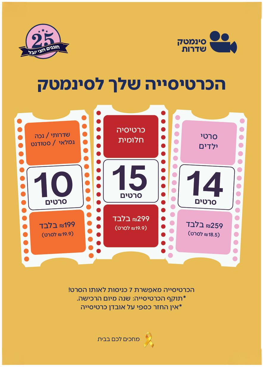 - למנויים, רכישת כרטיס לסרט מותנית בהצגת המנוי בצמוד לתעודה מזהה.